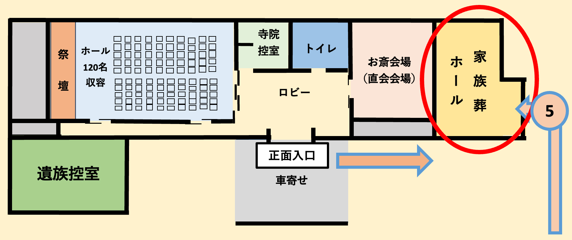 ☞家族葬ホールは見取り図右下の⑤『家族葬ホール』のご利用になります。